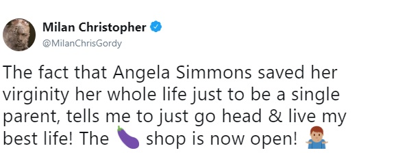 Taking to Twitter, Milan wrote: “The fact that Angela Simmons saved her virginity her whole life just to be a single parent, tells me to just go head & live my best life! The ? shop is now open! ????”